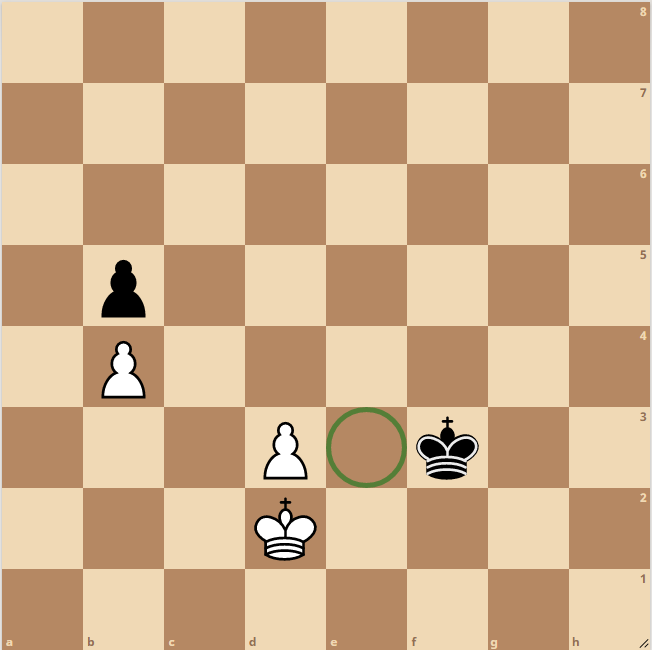 The previous game showed black to move, but what if white is to move. Black occupies the corresponding square of f3 to d2. White needs to be able to get to either d4, where he can move to capture the b pawn and win, or get to e2 or e3 as we saw in the previous game. This makes d4, e2, and e3 key squares that white wants to get to.
